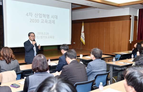 이재정 경기도교육감은 26일 도교육청 남부청사에서 열린 2018 전산직 공무원 역량강화 직무연수에 참석해 ‘창의성과 다양성의 융·복합 시대, 새로운 도전과 희망’을 주제로 특강을 실시했다./도교육청 제공
