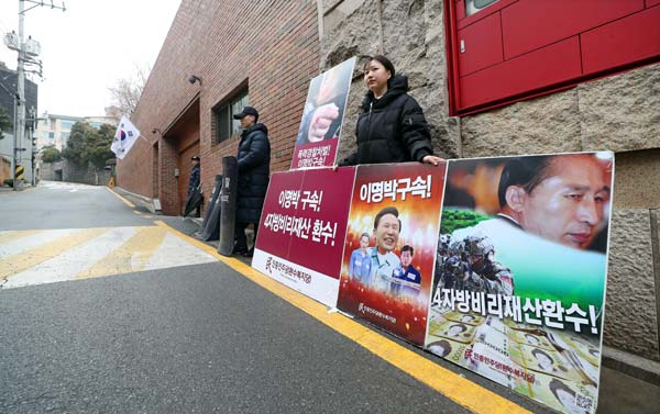 서울중앙지검이 이르면 5~6일쯤 문무일 검찰총장에게 이명박 전 대통령에 대한 직접 조사 계획을 보고할 것으로 알려진 4일 오후 이 전 대통령 자택 앞에서 민중민주당 관계자가 이 전 대통령 구속을 촉구하는 1인 시위를 하고 있다. /연합뉴스