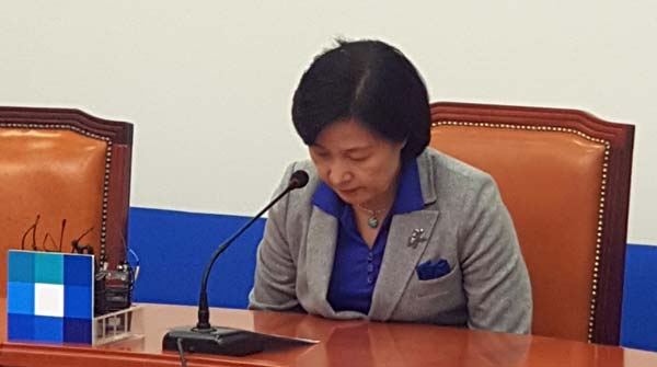 더불어민주당 소속 안희정 충남지사가 자신의 공보비서를 성폭행했다는 주장이 나온 5일 추미애 대표가 국회에서 긴급 최고위원회 결과를 브리핑하며 인사하고 있다./민주당 제공