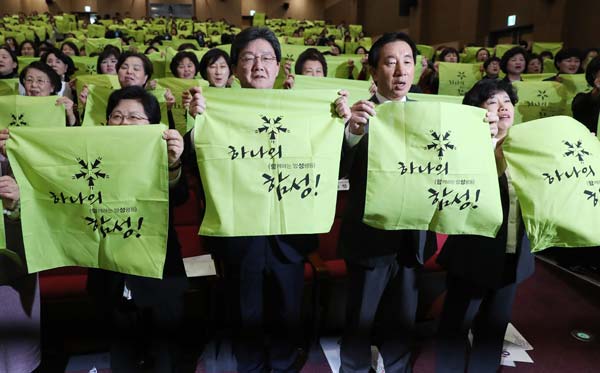 8일 오후 국회 의원회관에서 열린 3·8 세계여성의 날 기념행사에서 바른미래당 유승민 공동대표, 자유한국당 김성태 원내대표, 민주평화당 조배숙 대표 등이 ‘me too’를 지지하는 퍼포먼스를 하고 있다. /연합뉴스