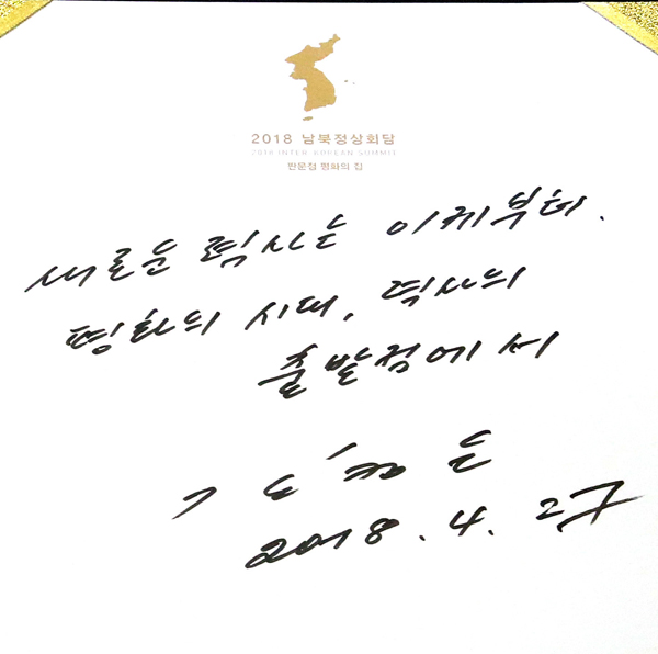 김 위원장은 이날 회담 장소인 남측 ‘평화의 집’에 도착, 1층에 마련된 방명록에 서명하고 문재인 대통령과 함께 기념촬영을 했다.