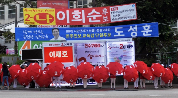 이재호(59) 자유한국당 연수구청장 후보의 빨간 우산을 든 이색 유세단이 눈길을 끌고 있다.