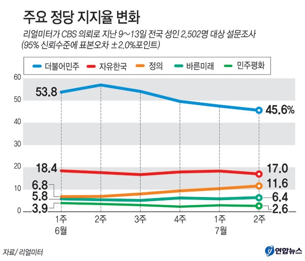 정당 지지도에선 민주당이 1.9%p 내린 45.6%로 1위를 지켰다.