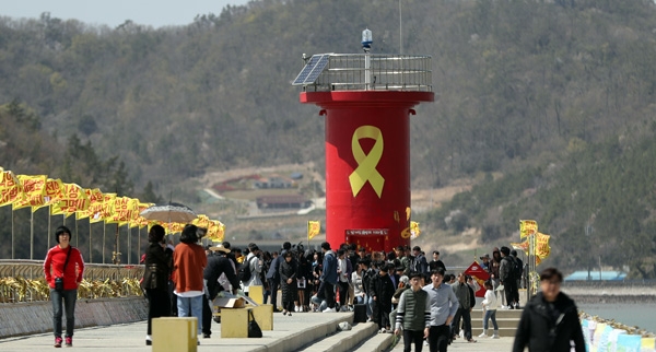 세월호 5주기를 하루 앞둔 15일 사고해역과 인접한 전라남도 진도군 팽목항에 지역 주민과 학생들의 추모가 이어지고 있다.▶▶관련기사18면 /연합뉴스