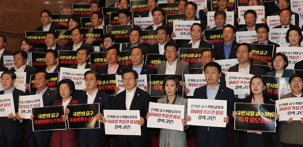 나경원 원내대표는 “더불어민주당 이해찬 대표가 260석을 이야기할 때 설마 했는데 지금 보니 좌파독재 플랜이자 개헌까지 마음대로 하겠다는 것이다. 목숨 걸고 막아야 한다”고 말했다.