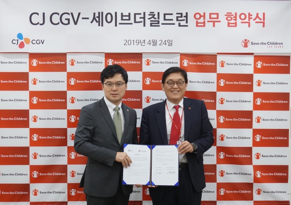 정태영 세이브더칠드런 사무총장과 이동현 CJ CGV 경영지원실장은 서울 마포구 소재 세이브더칠드런 본부에서 열린 협약식에서 아동의 권리 증진과 아동 삶의 질 향상 등을 위해 앞으로 1년간 두 기관이 적극 협력키로 했다.