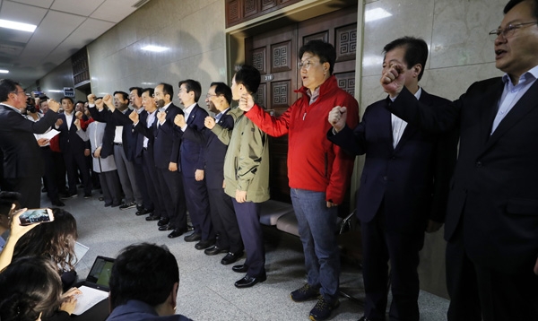 이 같은 상황에서 한국당 의원 10여명은 이날 오전 오 의원에서 바른미래당 사개특위 위원으로 교체된 채이배 의원실을 찾았다.