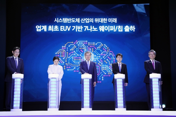 문재인 대통령이 성윤모 산업자원부 장관, 이재용 부회장 등과 30일 오후 시스템 반도체 비전 선포식이 열린 삼성전자 화성캠퍼스 부품연구동(DSR)에서 세계최초 EUV공정 7나노로 출하된 웨이퍼·칩 공개 세리모니를 하고 있다. 첫번째 출하 제품은 아니다. 문 대통령 좌우는 연구원들. /연합뉴스
