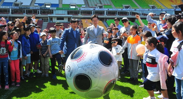 이재명 경기도자사와 더불어민주당 김영진 의원이 6일 수원시 팔달구 수원월드컵경기장에서 열린 경기도 공공기관 어벤져스 첫 공동기획 ‘어린이날 기념 주경기장 개방’ 행사에 참석해 아이들과 대형 축구공으로 시축을 하고 있다./조병석기자 cbs@