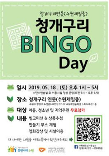 수원시청소년재단(이사장 홍사준)은 오는 18일 오후 1시부터 5시까지 청소년자유공간 청개구리 연못(수원제일중)에서 청소년과 지역주민들을 위한 ‘청개구리 BINGO-day’를 운영한다.