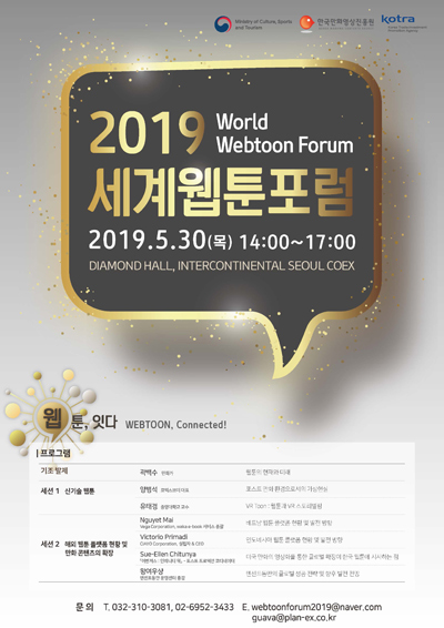 만화진흥원과 대한무역투자진흥공사(사장 권평오, 이하 코트라)가 공동주관하고 문화체육관광부가 후원하는 세계웹툰포럼은 ASIA-EU 카툰커넥션(애니메이션·웹툰 기업 간(B2B) 수출상담회)과 연계 개최돼 웹툰 수출·투자 상담회, 애니메이션 컨퍼런스, 기업 피칭 등 다양한 비즈니스 행사 등이 함께 진행될 예정이다.