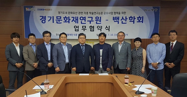 경기문화재단 경기문화재연구원(원장직무대리 이병훈)과 백산학회(회장 정운용)는 10일 경기도내 문화유산 공동학술연구 및 연구논문 공모사업 협력을 위한 업무협약(MOU)을 체결했다.