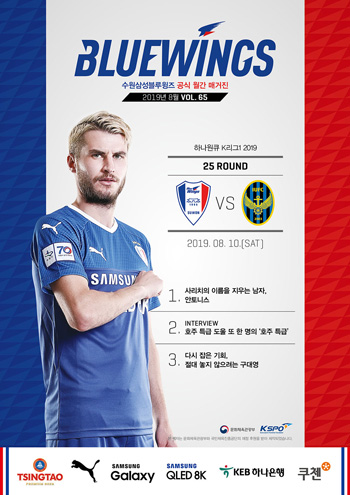 수원은 오는 10일 오후 8시 수원월드컵경기장(빅버드)에서 펼쳐지는 ‘하나원큐 K리그1 2019’ 25라운드 인천UTD와의 홈경기를 맞아 블루윙즈매거진 8월호를 발행한다고 7일 밝혔다.