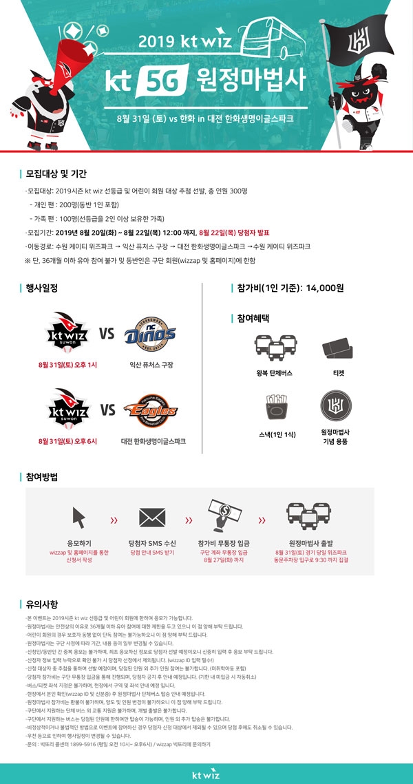 원정 마법사에 참여한 팬들에게는 수원 KT위즈파크에서 익산 구장을 거쳐 대전 한화생명 이글스 파크까지 왕복 이동하는 버스와 입장 티켓, 간식과 응원 용품, 기념 배지 등 다양한 혜택이 제공되며 참가 비용은 1인당 1만4천원이다.