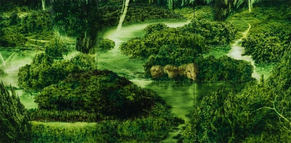 초록빛의 다채로운 변화에 집중한 김건일 작가는 장소적 특정성이 느껴지지 않는 경관을 마음 속 풍경으로 표현해 낸 작품으로 풍경이 가지는 자연에 대한 향수와 마음속 서정성이 융화되어 심리적 풍경을 묘사했다.