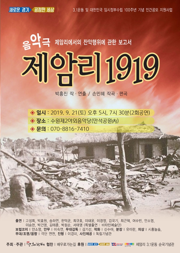박효원, 송하연, 이태윤, 최규호 등 뮤지컬배우들과 수원 시민들이 함께 출연해 시뻘건 불구덩이 속에서 조국의 독립을 맞지 못한 채 한줌의 재로 승화한 우리 선열들의 아픔과 눈물을 노래한 음악극 ‘제암리1919’는 21일 오후 5시와 7시30분, 두 차례 공연되며 전석 무료다.