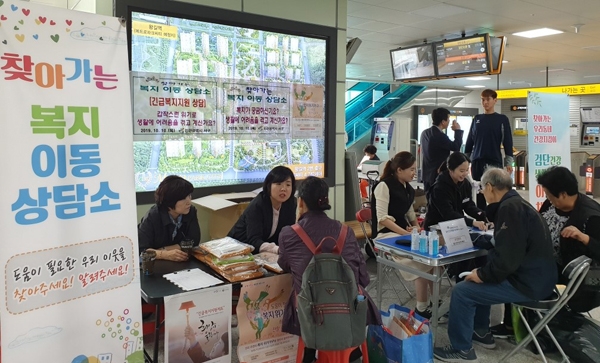 인천 서구는 최근 직접 찾아가는 현장 중심의 긴급복지상담을 위해 왕길역 내에서 ‘찾아가는 통합복지 이동상담소’를 운영했다고 14일 밝혔다. 이번 상담소는 복지사각지대에 있는 소외된 이웃 발굴을 위한 홍보와 긴급복지지원제도 안내 및 상담을 원하는 주민들에게 긴급복지 집중상담을 진행했다. /이정규기자 ljk@