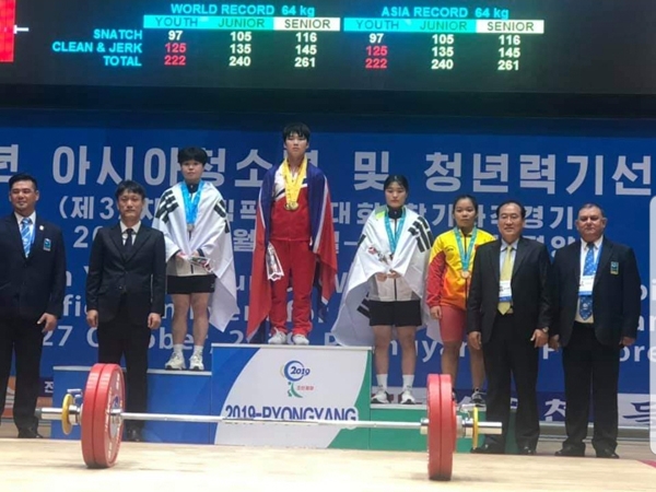 김한솔(17·수원 청명고·왼쪽 첫번째)이 2019 아시아유소년·주니어 역도선수권대회에서 은메달 3개를 목에 걸었다.