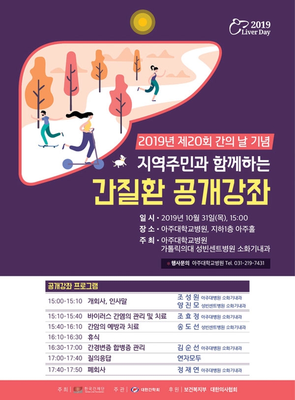 아주대병원과 성빈센트병원이 간의 날을 맞아 오는 31일 오후 3시 아주대병원 지하 1층 아주홀에서 지역주민을 위한 간질환 공개강좌를 개최한다.