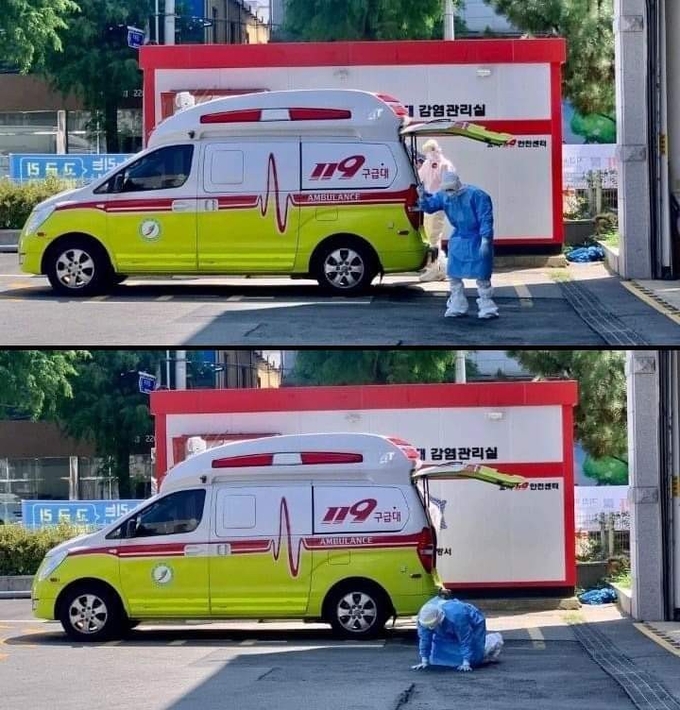 전신을 감싼 푸른색 방호복을 입은 의료진이 힘겹게 구급차 뒷문에 몸을 기대더니 얼마 지나지 않아 풀썩 땅 바닥에 쓰러졌고, 한동안 일어나지 못했다.