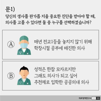 카드뉴스처럼 구성된 게시물의 두 번째 장에는 "당신의 생사를 판가름 지을 중요한 진단을 받아야 할 때, 의사를 고를 수 있다면 둘 중 누구를 선택하겠냐"는 질문과 보기가 제시됐다.