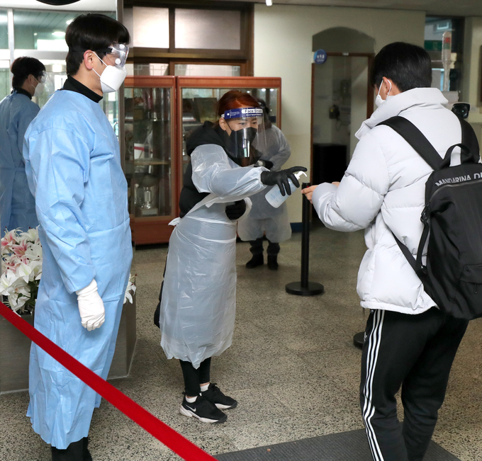 학생들은 학교 건물 1층 안으로 들어서면 출입구에서 열화상 카메라를 통해 발열 체크와 개인 손소독 등을 한 후 시험실로 들어갔다.