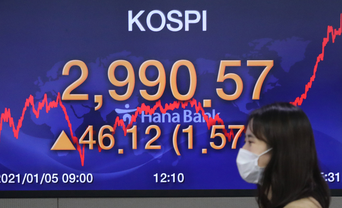 코스피 지수는 작년 12월에 이어 새해에도 시세를 분출, 5일 종가는 2,990.57P로 마감했다. 개인투자자는 새해 이틀간 1조7천억 원어치 주식을 순매수했다.