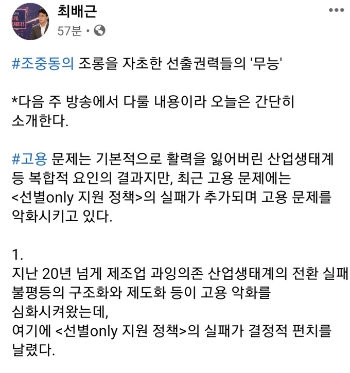 최배근 교수는 17일 SNS를 통해 “지난 20년 넘게 제조업 과잉의존 산업생태계의 전환 실패, 불평등의 구조화와 제도화 등이 고용 악화를 심화시켰다”면서 “여기에 ‘선별 only 지원 정책’의 실패가 결정적 펀치를 날렸다”며 이 같이 밝혔다.