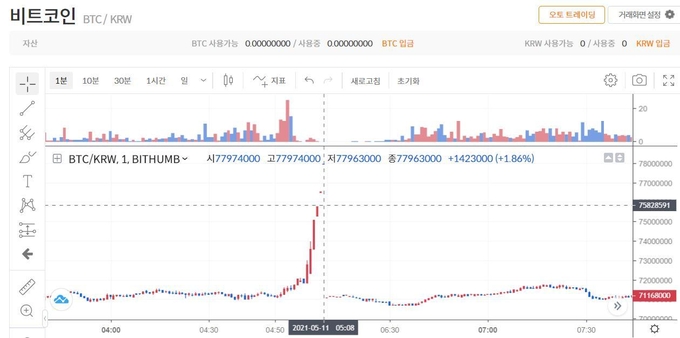 빗썸 거래소 화면상 비트코인은 이날 오전 5시 이전까지만 해도 7천200만원 안팎에 머물렀으나 오전 5시 8분에 7천797만4천원까지 급등했다. 이후 오전 6시 8분까지는 그래프가 뚝 끊겨 있다가 다시 7천100만원대로 내렸다.