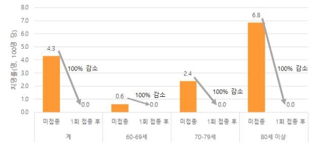 이는 고령층 중에서도 나이가 더 많을수록 확연하게 나타났는데, 코로나19 감염 시 6.8%의 치명률을 보인 80세 이상에서도 1회 접종 후에는 치명률이 '0'으로 떨어졌다.