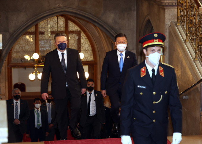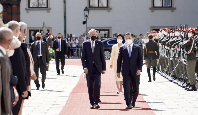 전날 오스트리아의 수도 빈에 도착한 문 대통령 부부는 이날 오전 10시 호프부르크궁 발하우스 광장에서 열린 공식 환영식을 시작으로 국빈방문 일정에 나섰다.