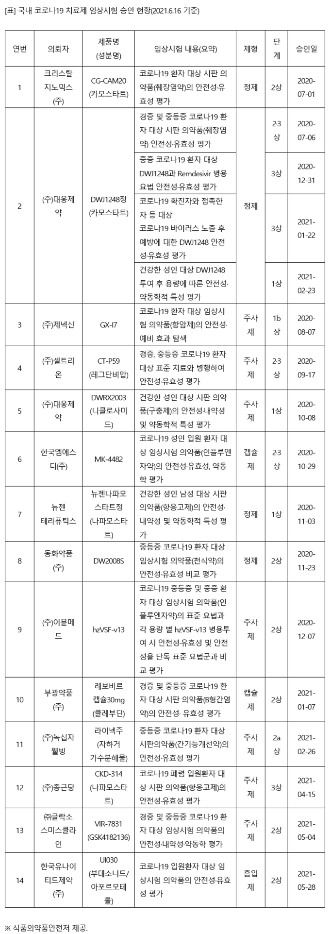 17일 식품의약품안전처에 따르면 국내에서 임상시험에 진입한 코로나19 치료제 14건 중 4건은 정제, 2건은 캡슐제 등 주사제보다 투약 편의성을 높인 '경구용'(먹는 약)이다.