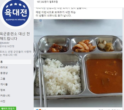 17일 페이스북 페이지 '육군훈련소 대신 전해드립니다'에 글을 올린 28사단 소속 한 병사는 "지난 15일 석식으로 일반 병사들에게 고기 한 점 없는 닭볶음탕을 제공했다"며 "코다리 강정은 양이 적어 한 덩이를 가위로 2~4번 잘라 작게 2조각씩 주고, 김 하나 던져줬다"고 밝혔다.