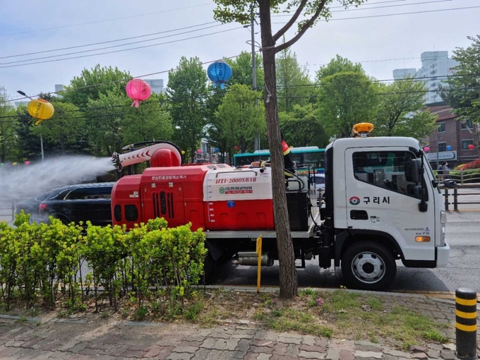 구리시가 주요 도로변 반송나무, 메타세콰이어 등 가로수의 병해충을 최소화하기 위한 지상 방제작업에 총력을 기울이고 있다.