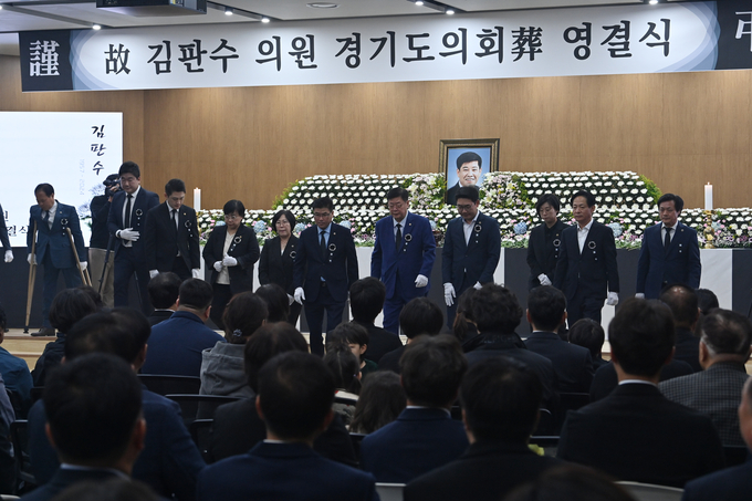 3일 오전 수원시 영통구 경기도의회 대회의실에서 암 투병 중 별세한 고(故) 김판수 경기도의원의 영결식이 경기도의회장으로 진행되고 있다. [ 경기신문 = 옥지훈 기자 ]