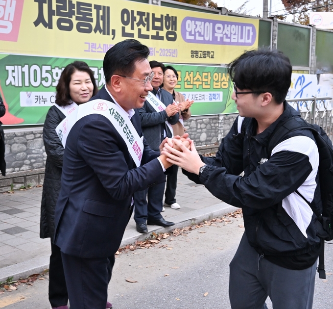 전진선 양평군수가 14일 관내 대입수능 시험장인 양평중학교, 양일중.고등학교,양평고등학교를 방문해 시험장에 입실하는 수험생들에게 따뜻한 응원의 메시지를 전달했다.