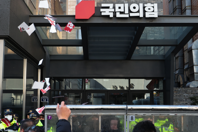 한편 9일 밤에는 여의도 국민의힘 중앙당사 앞에서 ‘국민의힘 로고가 그려지고 ’탄핵동조 국민의힘‘이라고 쓰여진 대형 현수막과 ’내란수괴 윤석열‘이라고 쓰여진 대형 현수막을 찢는 퍼포먼스도 벌어지기도 했다.