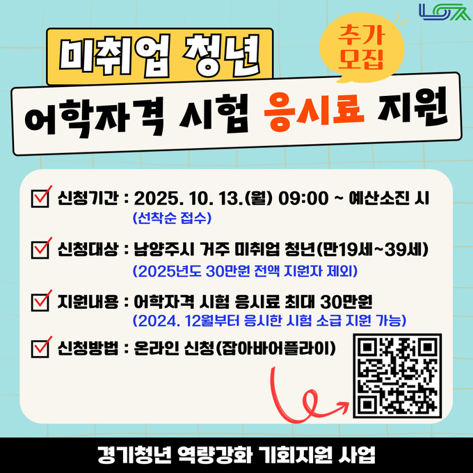 이번 사업은 높은 청년 수요로 조기 마감된 어학·자격 시험 응시료 지원을 확대하기 위해 마련됐다. 시는 경기도 예산을 추가 확보해 더 많은 청년이 지원받을 수 있도록 했다.