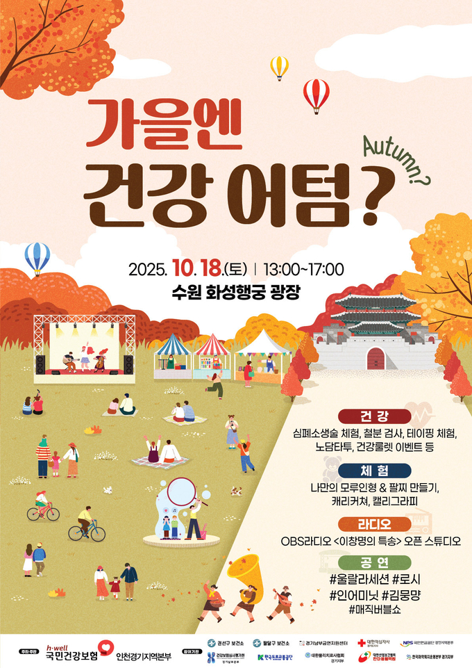 국민건강보험공단 인천경기지역본부가 오는 18일 수원 화성행궁 광장에서 지역 주민과 함께하는 건강축제 ‘가을엔 건강 어텀(Autumn)?’을 개최한다.