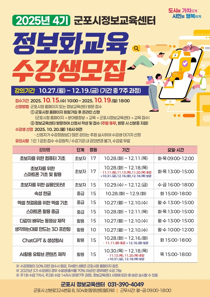 시는 시민들의 정보화 시대에 대한 적응 능력 향상 및 정보 소외 계층의 디지털 격차 해소를 위해 운영되는 ‘2025년 4기 시민정보화교육’의 수강생을 오는 15일부터 19일까지 모집한다고 13일 밝혔다.