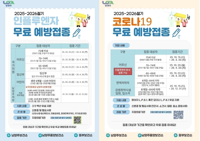 남양주시는 9월 22일부터 내년 4월 30일까지 ‘2025-2026절기 코로나19·인플루엔자 예방접종 사업’을 추진한다고 밝혔다.