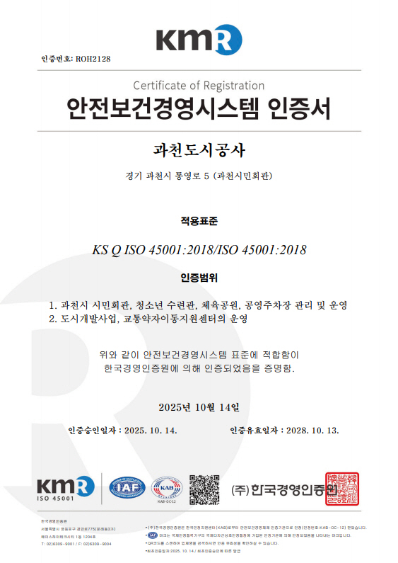 과천도시공사, 안전보건분야 국제표준 'ISO 45001' 인증 취득