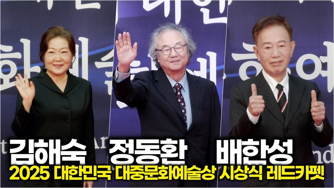10월 23일(목) 오후, 서울 중구 국립극장 해오름극장에서 '2025 대한민국 대중문화예술상' 시상식이 열려 식전 행사인 레드카펫에서 문화훈장 수상자인 배우 김해숙(은관), 정동환(보관), 성우 배한성(옥관)이 참석해 포토타임을 갖고 있다.