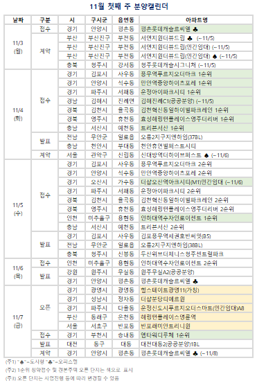 부동산R114에 따르면 11월 첫째 주 청약은 경기 파주시 서패동 '운정아이파크시티', 경기 김포시 사우동 '풍무역푸르지오더마크', 충남 서산시 예천동 '트리븐서산' 등에서 진행된다.
