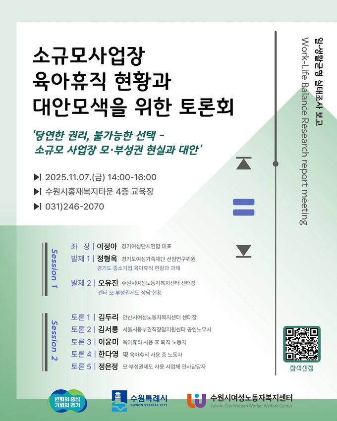 수원시여성노동자복지센터가 오는 7일 오후 2시 수원시홍재복지타운에서 '소규모 사업장 육아휴직 현황과 대안 모색을 위한 토론회'를 개최한다.