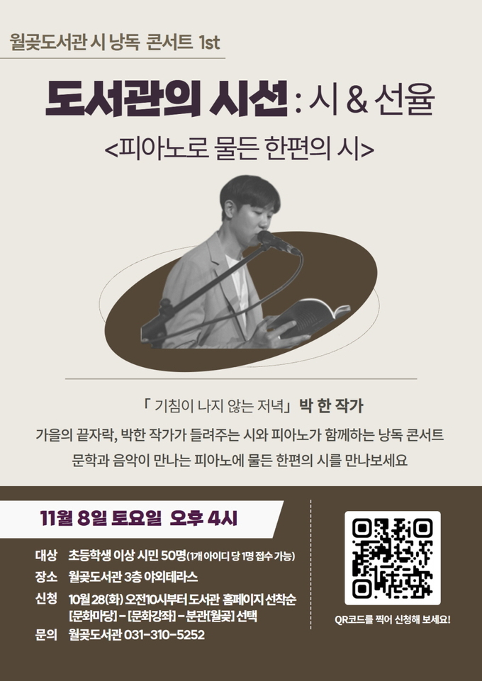 전행주 시흥시 중앙도서관장은 “이번 행사를 통해 시민들이 시와 음악을 함께 즐기며 문학의 새로운 매력을 느낄 수 있기를 바라며, 앞으로도 도서관이 시민의 문화적 소통의 공간으로 자리 잡을 수 있도록 다양한 프로그램을 운영하겠다”라고 말했다.