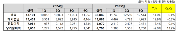 올해 3분기 누적 매출은 전년 대비 15.8% 증가한 3조 6882억, 영업이익은 13.9% 오른 6970억으로 집계됐다.