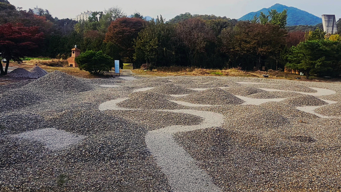 모란 미술관 옆 절터를 도화지 삼은 안작가는 수많은 자갈을 쌓아올린 7개의 큰 봉우리와 작은 동산들을 만들고 이를 감싸고 도는 굽이 굽이 길을 만들어냈다. 작품명 '굽이 굽이' 프로젝트는 걷고, 견디고, 성찰하는 과정을 통해 감사와 치유, 진리로 향하는 여정을 창조해냈다.