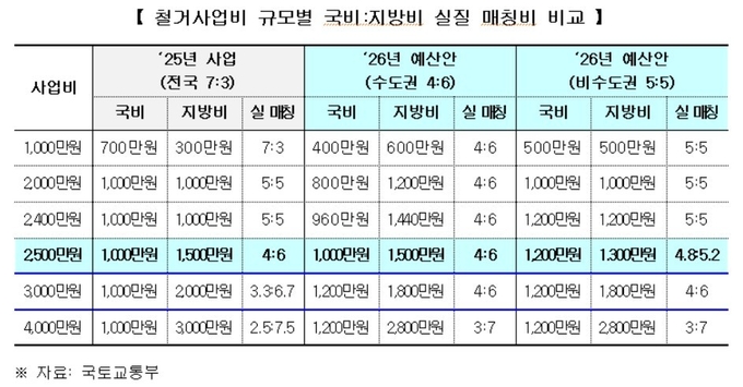실질 매칭비 비교에 따르면 철거사업비 규모별로 1000만원~2500만원 미만은 지방비가 올해에 비해 높아지며, 2500만원~3000만원은 올해와 같고, 3000만원 이상은 국비가 높다.
