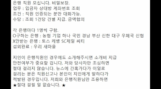 A씨는 이같은 점에 착안해 온라인으로 "은행 직원 모집. 당사자만 조심하면 절대 걸리지 않음"이라는 글을 올려 제1금융권의 모 은행 콜센터에서 보이스피싱 피해 담당자로 일하는 20대 여성 B씨를 조직에 가담시켰다.